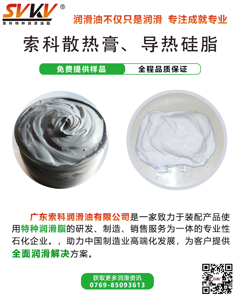 SVKV索科系列導熱硅脂適用溫度廣泛,不易出現風干硬化或熔化現象,同時具有耐高低溫能力。主要用于填充發熱體與散熱片之間的空隙,提高散熱效果,改善電子/電氣器件向散熱器或底盤的熱轉移,增加器件的總體效能。 SVKV索科導熱硅脂性能特點