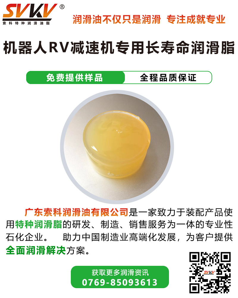 索科SVKV機器人RV減速機專用長壽命潤滑脂選用高性能基礎油,并添加多種高效抗氧化、抗腐蝕添加劑精制而成,是專為各種機器人減速電機齒輪和傳動部位而研制的齒輪潤滑油脂。索科SVKV機器人RV減速機專用長壽命潤滑脂能有效減少RV減速機磨損,降低噪音,達到延長使用壽命的效果。