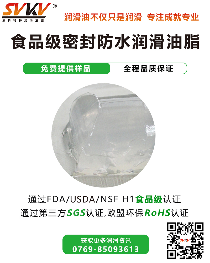 索科SVKV食品級密封防水潤滑脂符合美國FDA和USDA的法規和標準,并通過美國USDA/NSF H-1食品級認證,確保食品的衛生、安全。