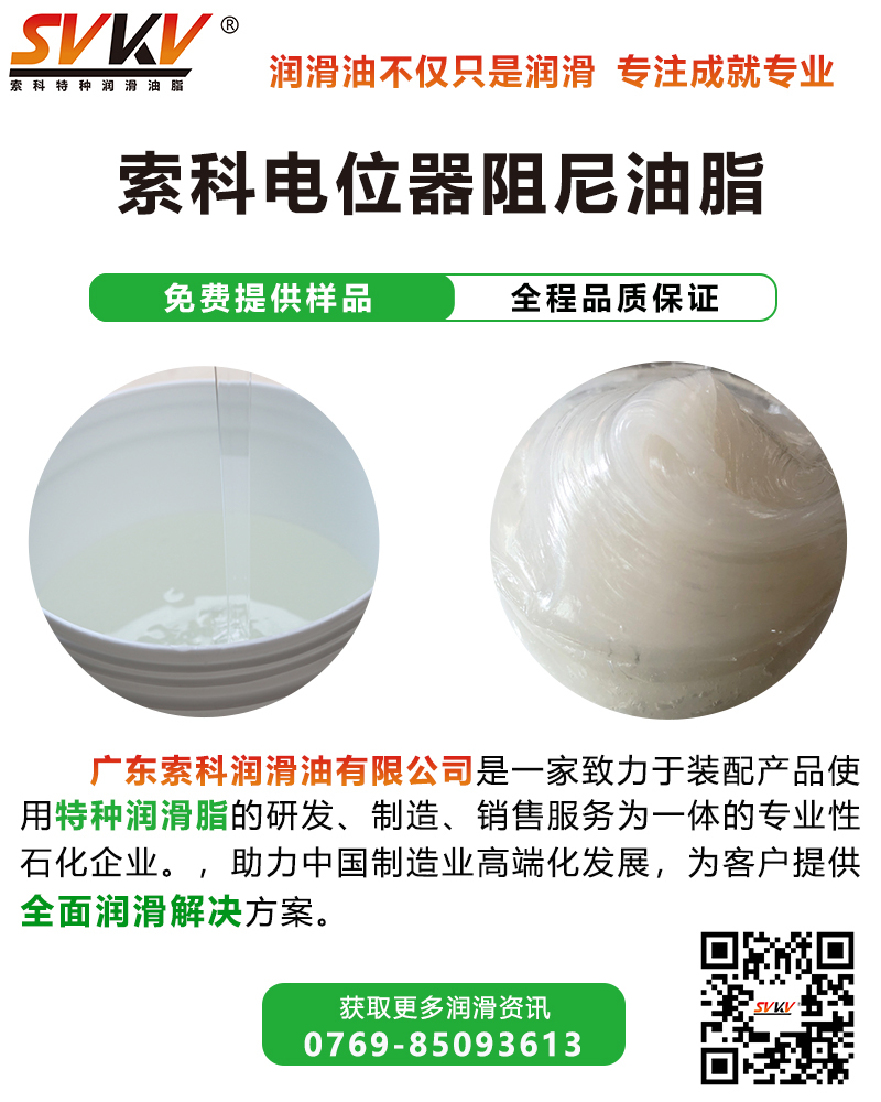 電位器的種類繁多,使用的場合不同,索科潤滑油對應出多款不同粘度的潤滑油脂,能滿足各種電位器不同工況阻尼要求,同時還可以按客戶實際需求進行個性化定制。